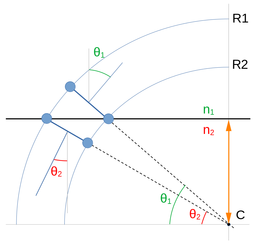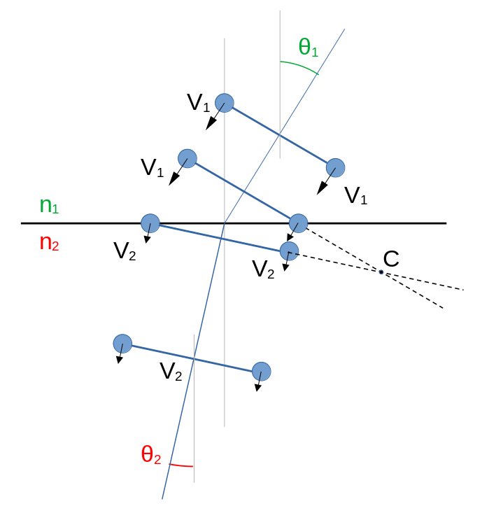 Le bipoint traverse l'interface n1 n2 en 2 temps (si θ1 ≠ 0): un premier point subit la variation de vitesse, puis l'autre.